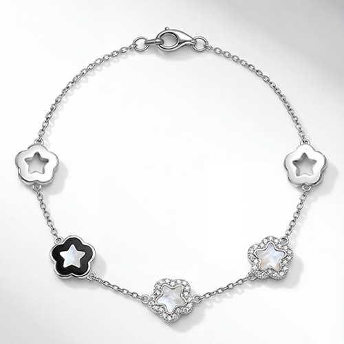 Elevate your jewelry collection with this exquisite bracelet from Adams 925 Silver Jewelry, thoughtfully crafted from authentic 925 sterling silver for lasting brilliance and durability. The bracelet showcases a series of delicate floral-inspired motifs, beautifully alternating between polished silver and deep black accents, creating a refined and sophisticated contrast.